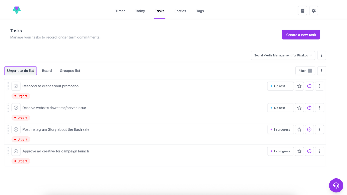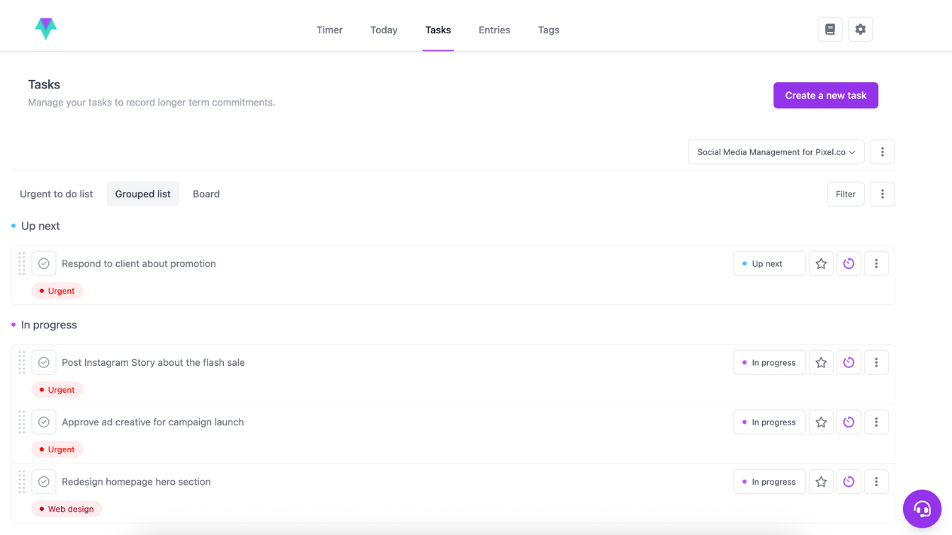 Grouped list by status: Tasks organised by their current status, giving you a clear overview of progress and priorities at a glance.