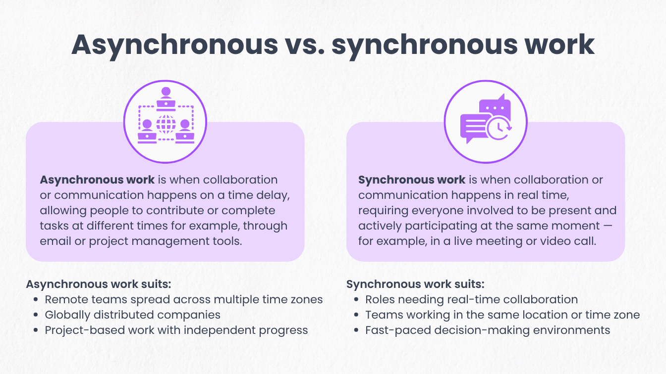 Synchronous work suits teams needing constant real-time collaboration, while asynchronous work fits distributed teams across time zones.